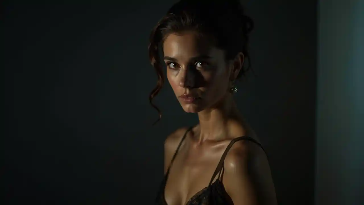 神秘的な人物のムーディーでコントラストの高い、映画のようなポートレート写真は、劇的で控えめな照明設定の下で撮影されました。深い影と微妙なハイライトは、陰謀と洗練された感覚を呼び起こしました。彼らの鋭い目はカメラをまっすぐに見つめ、彼らの肌の色は暖かいベージュとゴールドの背景と微妙に調和し、半透明のヒマワリとレースのローカットのパジャマを着ていました。 大胆で個性的なジュエリーと滑らかでモダンなヘアスタイル、背景のぼかし、グラデーション、最も深いインディゴから柔らかく柔らかいグレーへの移行、 全体的なノスタルジックさと古典的なハリウッドの魅力を微妙なフィルム粒子のテクスチャで追加します。.