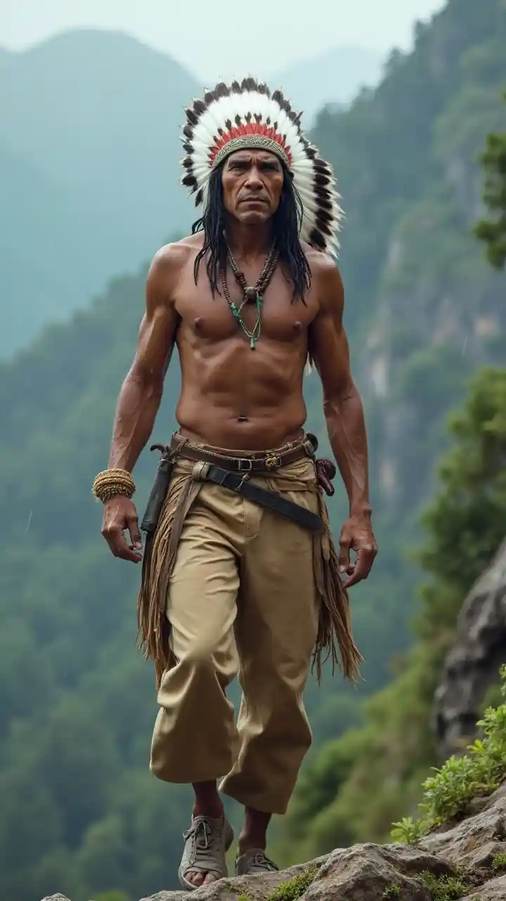 ネイティブアメリカンインディアン,約50歳,白いヘッドギアを身に着けています,平らな鼻,ライトブラウンの肌,ベージュのスエードパンツ,左腕のわら編みのブレスレット,腰の短剣,山側を歩いています,雨が降っています,シャープなディテール,高画質,高画像,超現実的な, lightroom,映画化された写真,プロの照明,現実的な,ボケフォーカス, 4 K, artstarion,すべての細部に焦点を当てる-- ar 9:16