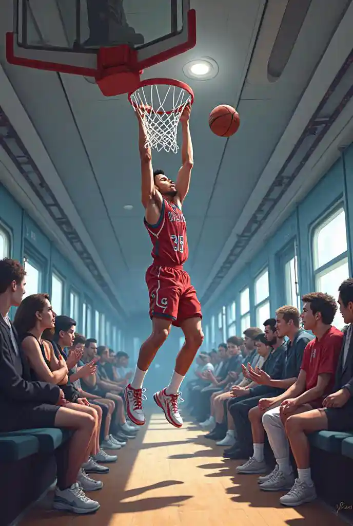 電車の中で「アニメ風NBAバスケシーン。. スーパーマンのダンクを決めた選手の、筋肉の動きが抜群のダイナミックな構図。. プレイヤーdanc
