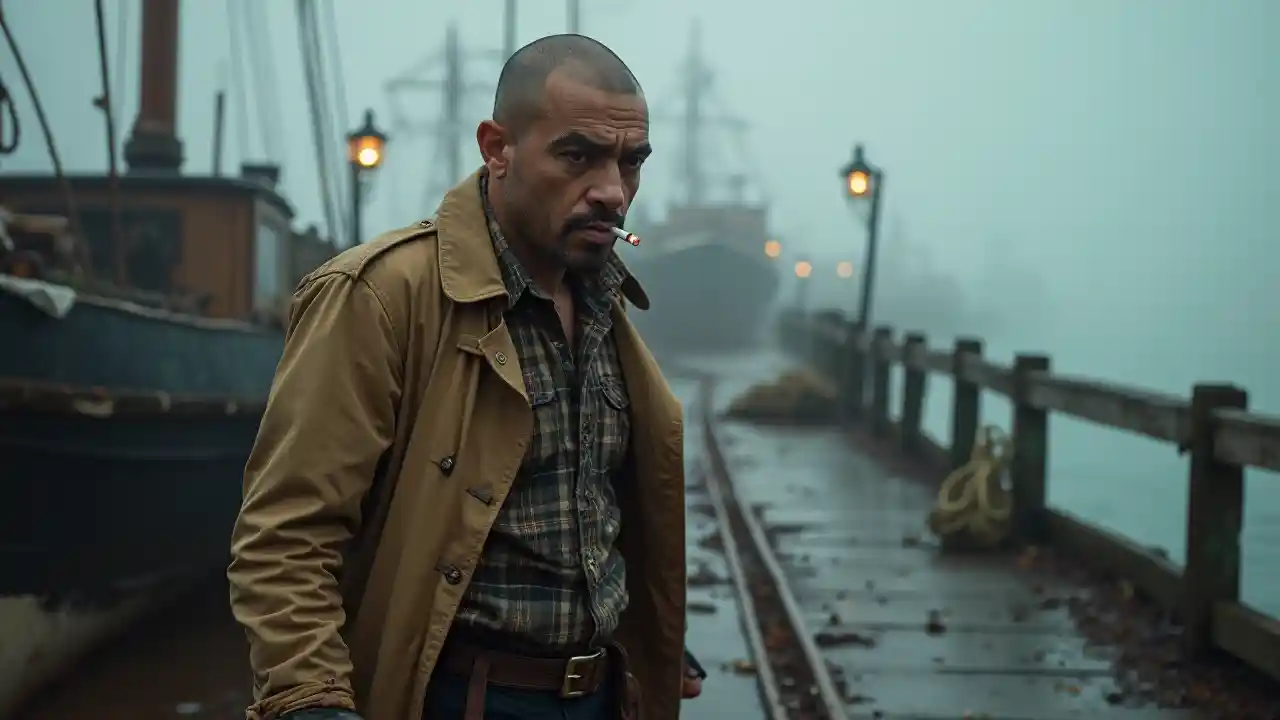 ニール・デグラス・タイソンは( (肩幅が広く、30代の北アフリカ系ヨーロッパ人男性) )、深いオリーブ褐色の肌をしており、あごの近くに古い火傷の跡が残っている、荒々しい角ばった顔をしていた。. 彼の頭は非常に近くに剃られており、うっすらとカールした髪の影を除いて、彼の目は普通ではありませんでした( (ヘーゼルグリーン、不眠症のために赤く染まった) )。. 彼は(汗で汚れたチェック柄のシャツの上に汚れた日焼けしたトレンチコート)を着ていて、指先にほつれた革の手袋とひびの入ったスチール製の作業靴を履いていた。. A ((半火のタバコが唇を震わせている))彼は不安そうに動いた。. 彼は(朝霧に浸ったビクトリア朝の港の桟橋)の上に、腐ったロープと捨てられた漁網が影にしがみついて立っていた。. 霧の中で死にゆく星のように、彼の後ろで薄暗い提灯が瞬いていた。.