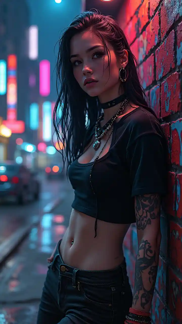 ネオンに照らされた夜の街の通りを壁に向かって立っているサイバーパンクの女性のリアルなポートレート。色とりどりの街明かりと星空がシーンを照らします。. 彼女の長い髪は自由に流れ、反射的な目と印象的なメイクで詳細で対称的な顔を描きます。. 彼女は多くの指輪、耳の穴、複雑なタトゥーでパンクの美学を体現しています。. 彼女の黒いTシャツは彼女の腹部を露出させていた。. ドラマチックな光が彼女のフォルムを際立たせ、その影が明暗のコントラストを生み出す。. 腕輪付きの長袖と泥だらけのブーツを身に着けた彼女は、生き生きとした落書きで飾られたレンガの壁に無造作にもたれかかっていた。. ウォーターハウス、ジョン・コンスタブル、アントニオ・モローなどの巨匠による印象派の壮大な油絵を彷彿とさせる作品で、スタジオジブリのストーリーテリングのエッセンスと新海誠の雰囲気が注ぎ込まれています。. ArtStationとCGSocietyで人気を博したこの作品は、ジェレミー・マンやグレッグ・マンチェスなどの現代アーティストに触発された未来的な都市景観の本質を豊かなディテールで捉え、神秘的で魅力的な感覚を呼び起こします。.