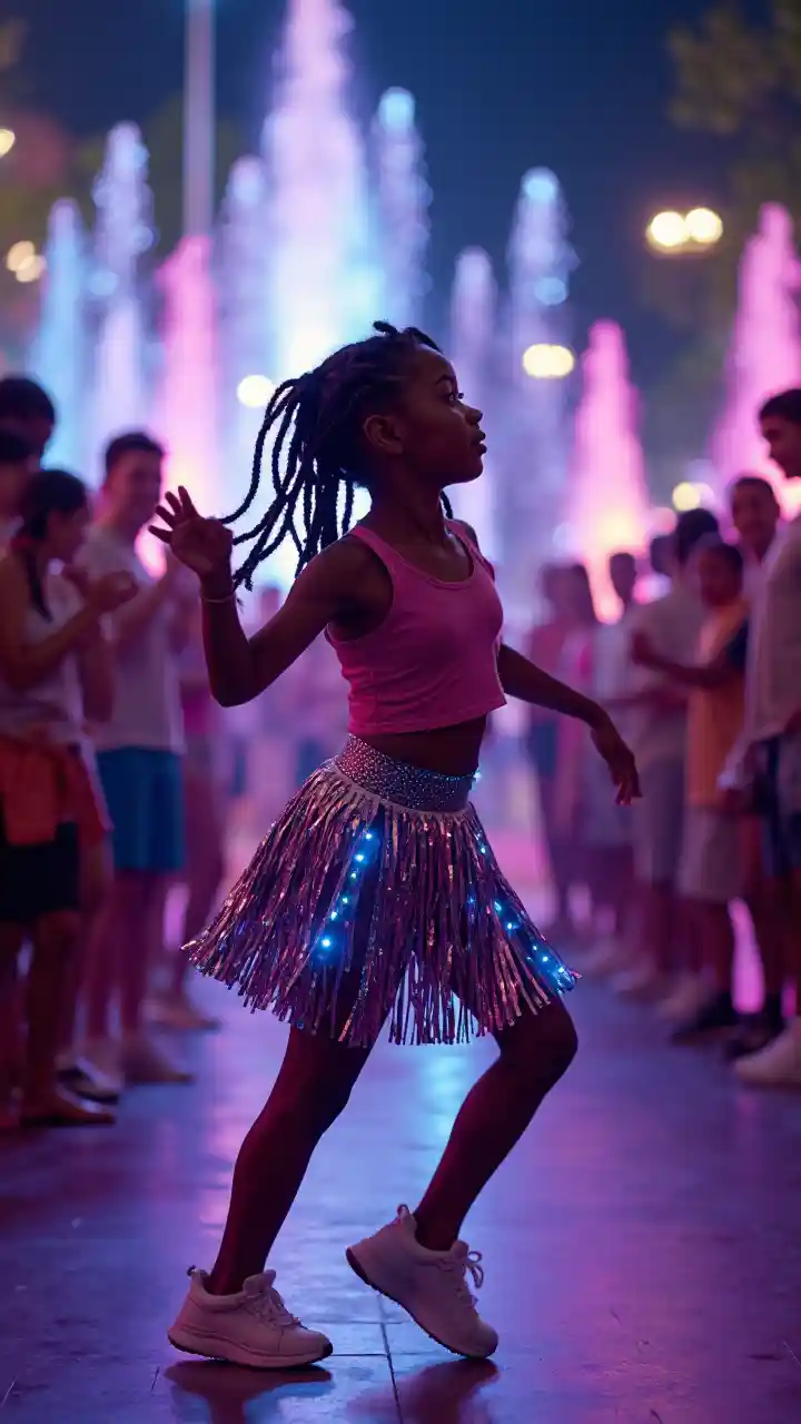 Jonathanネオンに照らされた広場でダンスを披露し、9歳のツイストされた黒人の女の子がLEDフリンジ付きのドレスを着ています。. 歓呼の群衆とホログラフィックの噴水が彼女を取り囲み、彼女の自信に満ちたアクションは、活気に満ちた都会のシーンで魅力的で活気に満ちたエネルギーを発散させます。.