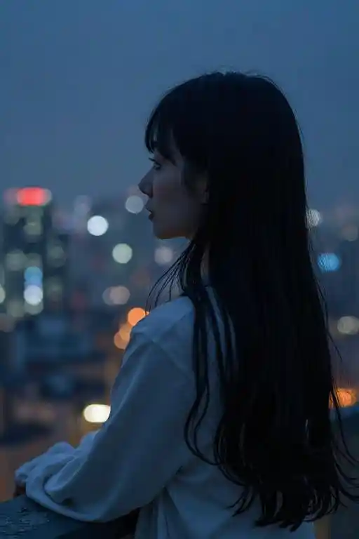 屋上から夜景を眺める女性 *20代の日本人女性、長いストレートの黒髪で、細い銀色のグリッターメッシュが両側に付いています。
