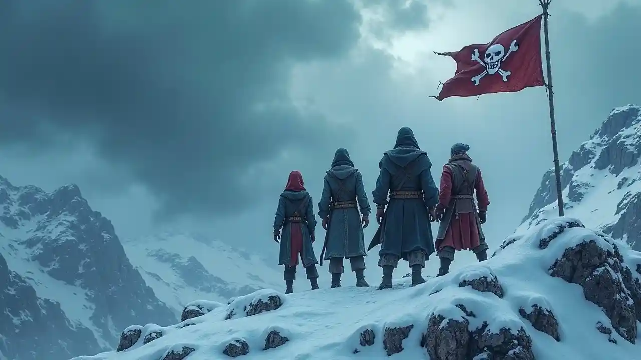 荒れ狂う空の下、雪をかぶった山の頂上に海賊旗を持った4人の海賊が立っていた。.