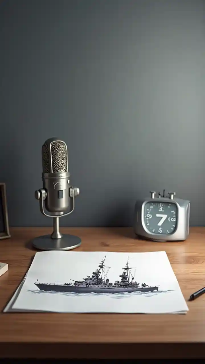 木製の机の上のPodcastマイク、灰色の壁の背景、ミニマリスト要素、明るい、机の上の紙の上の軍艦の絵、7日間のデジタルコンプレッサ、机の上の軍艦の置物、