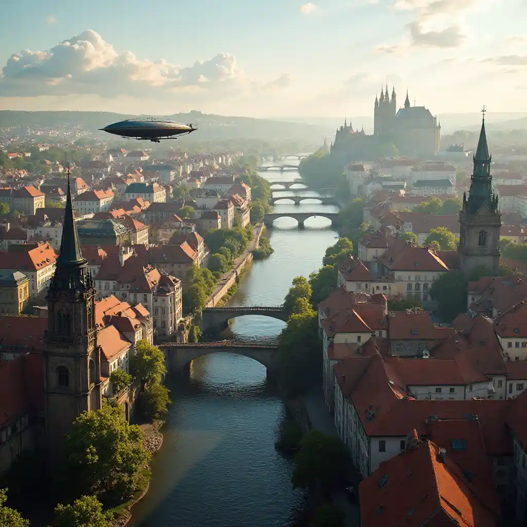 川と城を見下ろすプラハの鳥瞰図。. 手前のスチームパンク風の飛行船。. 晴れた日には,色彩が豊かである。. 太陽の光。. 高度な詳細な建物の詳細。. 明るい光、シャープなディテール