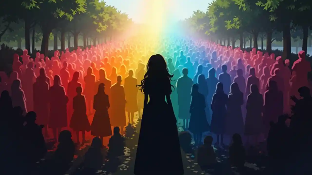 Nathanシーンの中心に集まった大勢の人々、それぞれのシルエットは、観客に向けられた女性のシルエット/4番目の壁を持つ異なるプライドフラッグで彩られています。これは、虹のひびが入った無地の黒です。. 誇り高き群衆から押し出された両側には、修道女、宗教的な人々、奇妙な人々が出てくるのを見ていました。. アニメ