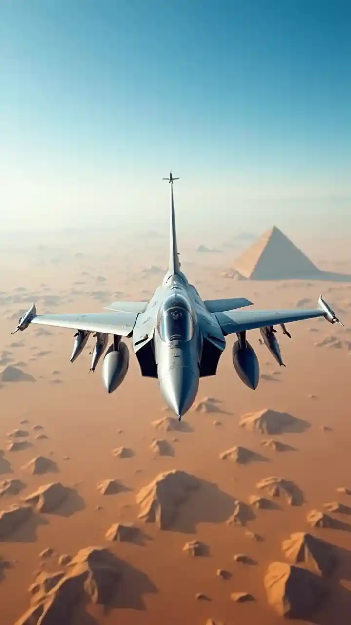 エジプトのピラミッドの背景に砂漠の上に飛ぶブルースカイダッソー航空
