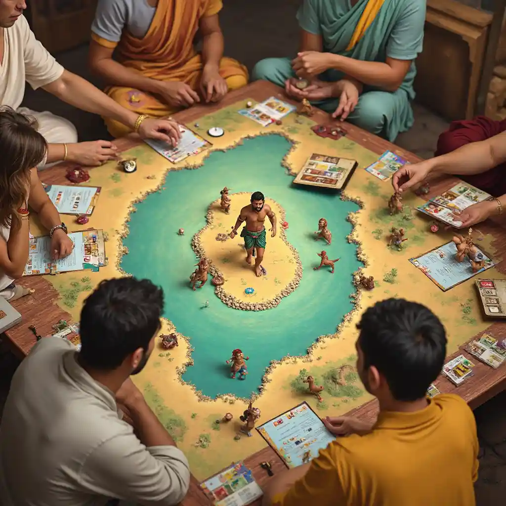 ゲームプレイ:プレイヤーはキャラクターを選択し、アヨティアからスタートします。. ゲームはラーマーヤナの章を通して進みます。. プレイヤーは自分のトークンを全面的に移動させ、目標を達成するためにタスクカードを描画します。. 彼らは、任務を遂行し、善行を行うことによって、ダルマポイントとバクティポイントを集めます。. プレイヤーは挑戦や戦闘に遭遇することがあり、それらを解決するために戦闘カードとサイコロを使用します。. カルマカードは予期せぬ出来事や運命のねじれをもたらすことができます。. ヘリテージカードは、プレイヤーの旅を助けるために特別な能力を提供します。. ゲームは、最終ミッション(ランカ戦争)を達成し、最終的な戦いに勝利し、シータを救い、ダルマを回復することで勝利します。.