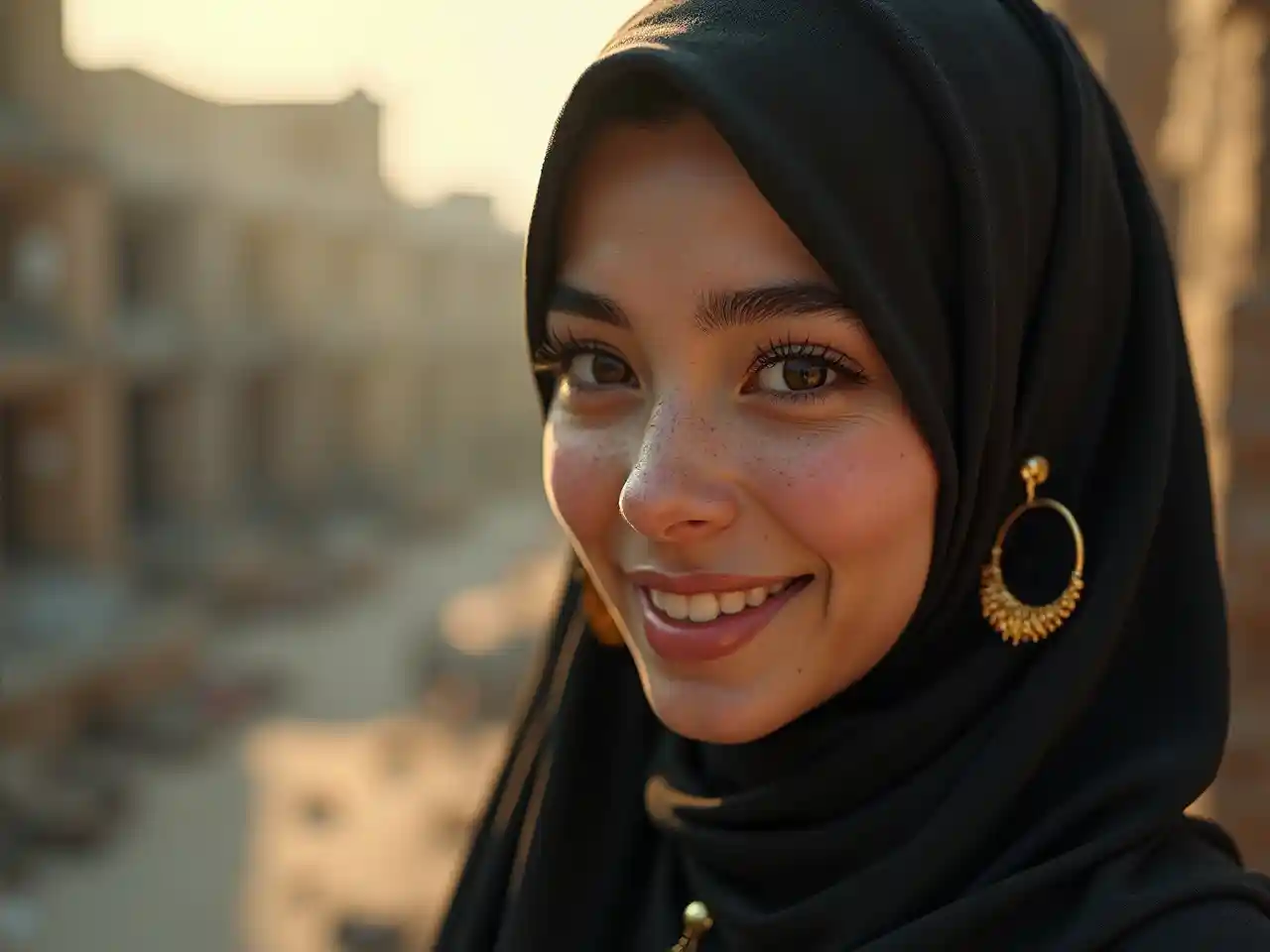 アジアの若いイスラム教徒の女性の超現実的な、超詳細な写真、黒いヒジャブ、笑顔、ゴールドジュエリー、シャイニング、太陽フラクタルの詳細、被写界深度、HOF、殿堂入り、詳細なゴージャスな顔、世界の終わりの環境、自然な体のポーズ、プロの写真家、プロの一眼レフカメラで撮影、ArtStationで人気、64 k、超詳細、超正確な詳細、ボケ照明、シュルレアリスム、 Thomas Kinkade背景,都市,超Unreal Engine, WLOP, Pauline Voße, Pascal Quidault, Christian Schob, Martina Fackova,複雑な,叙事詩的な,そばかす,桃の綿毛,詳細マスカラ