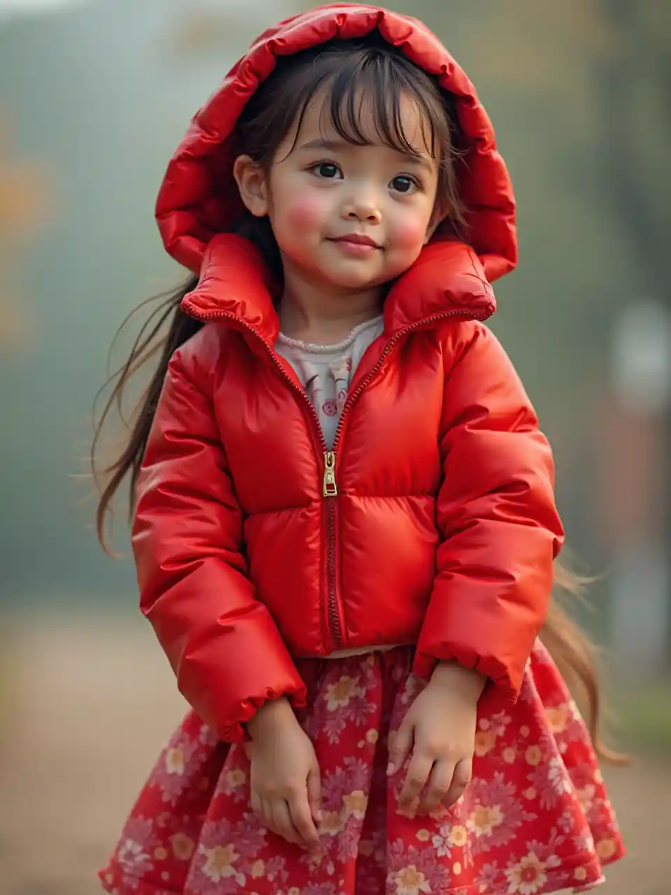 かわいい女の子,赤いインフレータブルダウンジャケットを着て,プリクラ,スーパーリアル,カラフル