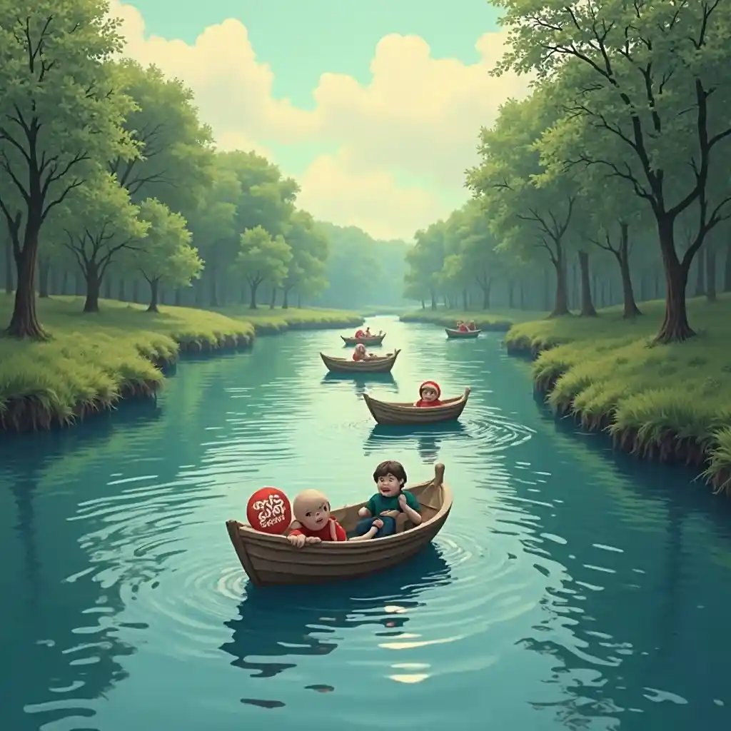 川は大地を穏やかに流れ、船は悲しみ、喜び、怒りというレッテルを貼られた感情を運びます。.