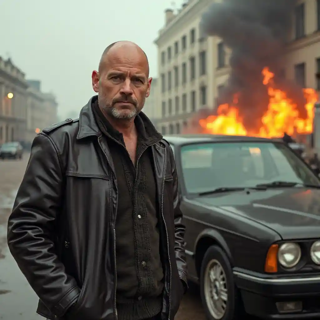 1990年のロシアに関する本の表紙、革のジャケットを着た坊主頭の男性、スラブの顔、革のジャケットを着た短い髪の男性が、燃えている建物を背景にBMW E 39の近くに立っています。