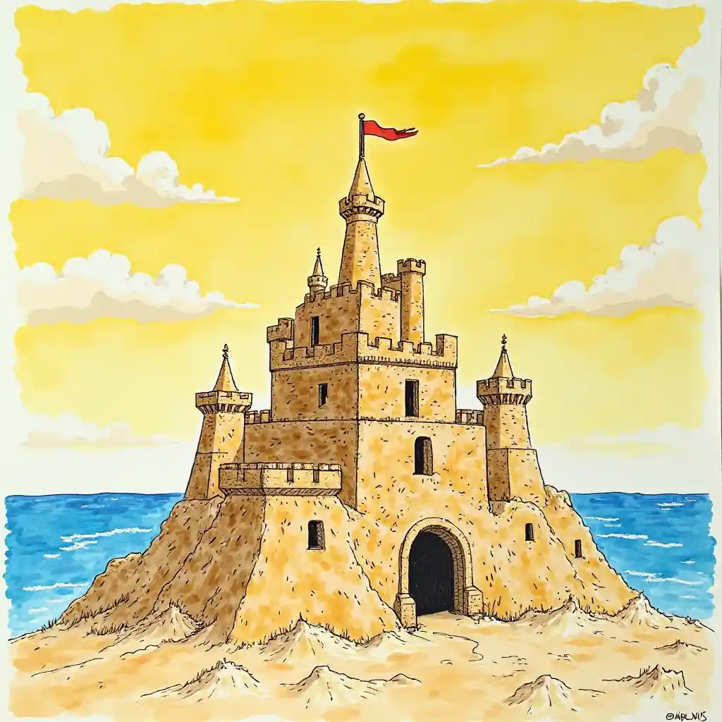 ジョージ・ウィルソンの芸術作品は、紙パルプ紙に描かれた明るい空と砂の城を描いたカラフルなイラストです。.