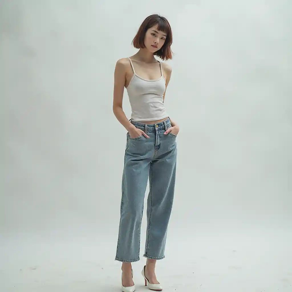 A (((かなり穏やかな女子大生))) with (((白い肌))))、(((もみあげの丸刈り、耳が丸見え)))(((大きな広い無邪気な、アーモンドのような目)))))、((自然に見える、磁器のような肌の色)) with (((肩の上着とジーンズのズボン)))、a ((ローカット、無地の白と((トレンド)) with ((空気のような、 ぼんやりとした背景) )全身撮影の背景として