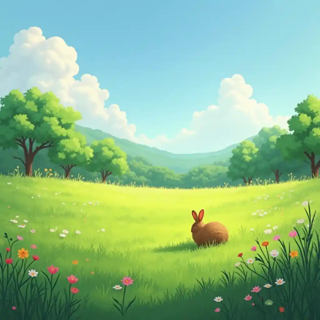 ウサギのような小動物が放牧されている美しい緑の野原を想像しました。. 背景は一面の青空と一面の静かな森である。. うさぎは背が小さく背中が金色で、野原の花が風景を美しくします。.