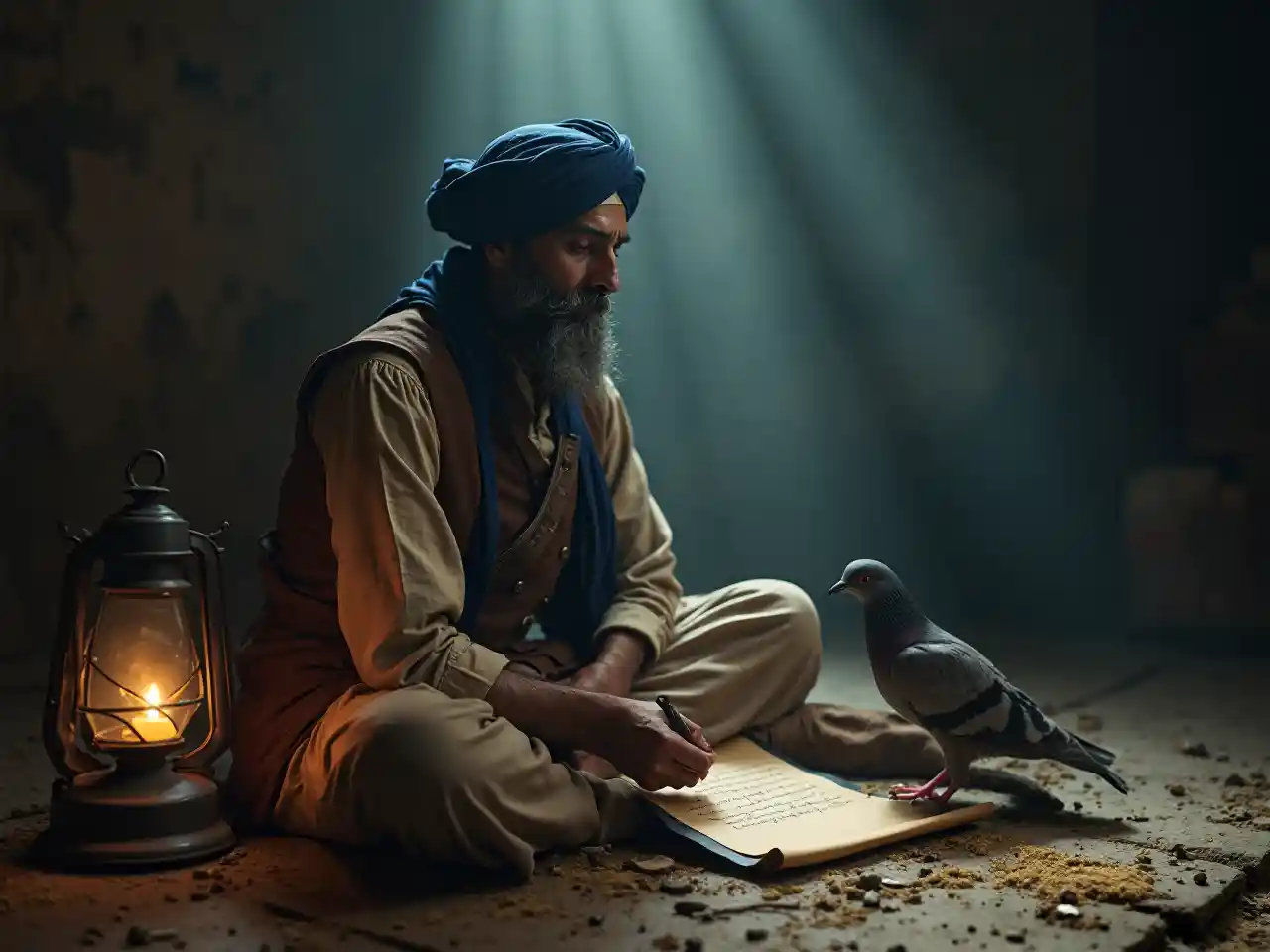 「伝統的な衣装に身を包み、紺色のターバンと弾丸のベストを身に着けた賢明なシーク教徒の兵士が、床にあぐらをかいて、提灯の光を通して古い巻物に手紙を書きました。. ハトが彼のそばに座って、メッセージを運ぶ準備ができています。. 部屋は薄暗く素朴で、空気中のほこりの中をビームが通り抜け、ノスタルジックで映画のような雰囲気を醸し出していました。. 彼の表情は穏やかで強烈で、責任と心の強さを体現しています。」