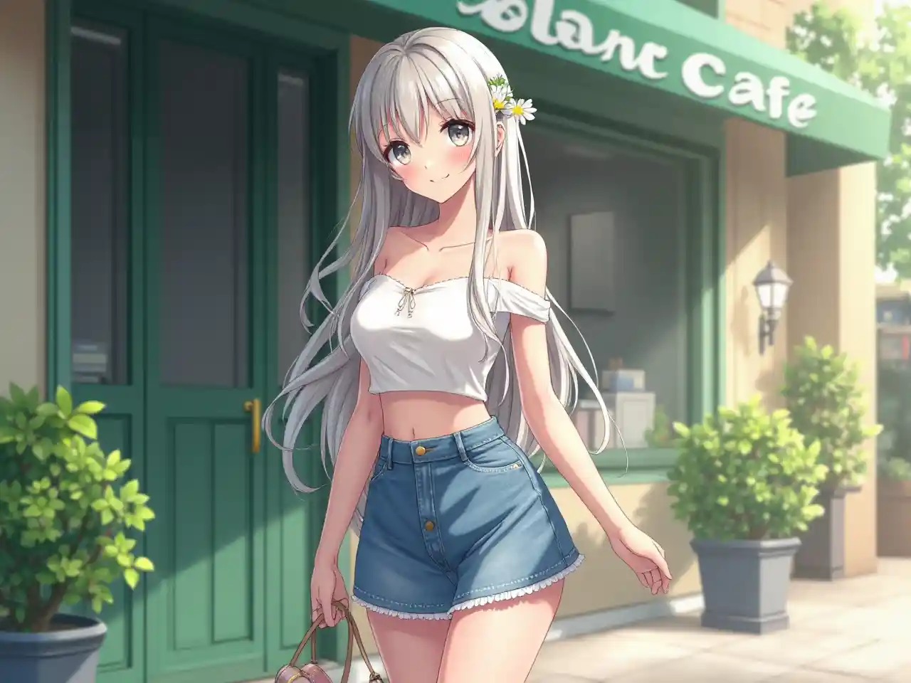 半現実的なアニメスタイルの美少女で、銀色のロングストレートの髪に女性らしい化粧をしており、白のオフショルダーとネーブルのトップスを着て、デニムのミニスカートをはいています。. 彼女はバッグを持って、グリーンゲートの魅力的なカフェの前に立っていました。. 雰囲気は明るく、やわらかな夏の雰囲気が漂っています。.
