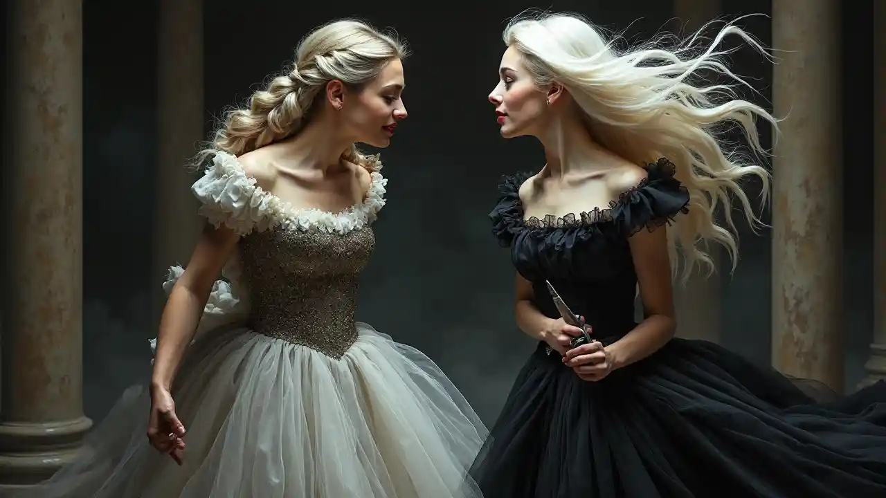 美しい2人の姉妹の間の((((裏切り)))を描いた((概念的に挑発的でエレガントに描かれた)構図を想像してみてください。そこでは、白い髪と輪郭のあるあごを持つ姉妹が((((白と黒のチュールドレス)))を着て、妹に微笑みかけていますが、背中に短剣を持って攻撃の準備をしていて、彼女は殺されました。. もう一人の姉は、何か少し怪しい(((白黒の市松)))と感じており、そのシーンはShakepearanスタイルの裏切り(微妙だが紛れもない)の裏切りであった。. 雰囲気は(柔らかい逆光) ( Luis Royoの)緻密で緻密な油絵です。.