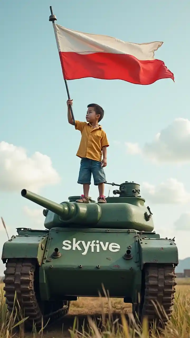 少年が赤と白の旗を振って緑のスチール缶の上に立って、スチール缶にSkyFiveの文字が書かれています。