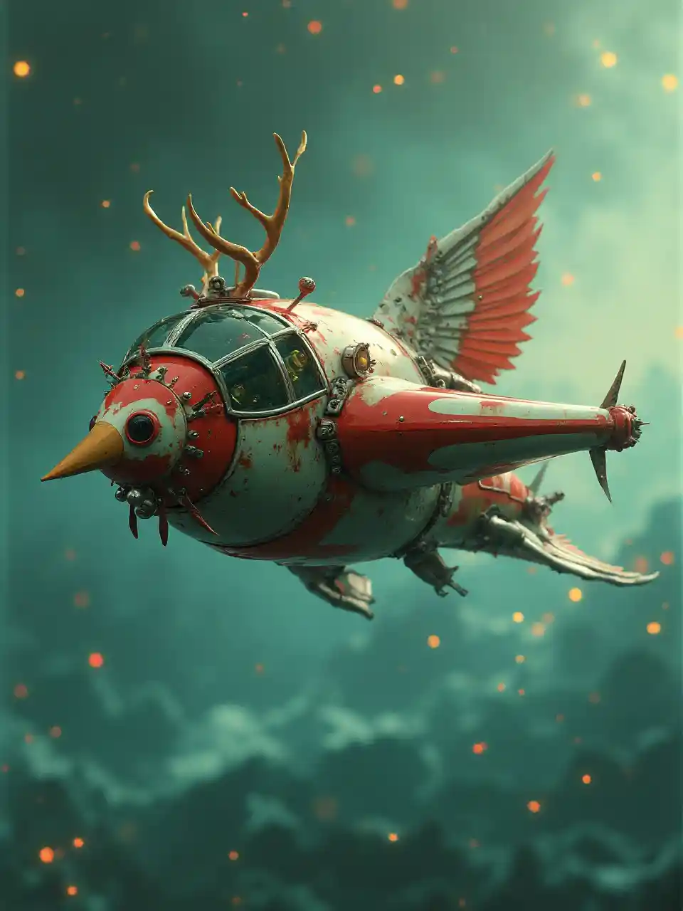 Mia翼と鋭いくちばしを備えたエネルギッシュなスターキングフィッシャーの鳥の形をした宇宙船、色付きのガラス窓の細部、赤、緑、白、トナカイの機械、多数のライト、海の上を飛ぶ、動きの速い、恐ろしいおとぎ話のページから引き裂かれたような、頑丈でシミュレートされたフィルム粒子のリアルな細部を捉えた写真、スペースアート、マットな絵画、Redshift、コンセプトアート