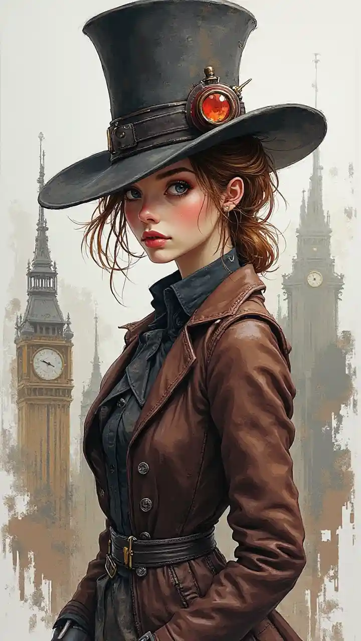 高い帽子と現代的な衣装を身に着けた対照的な背景の下で、非現実的で気まぐれなスチームパンクの女性の肖像画を描いた表現力豊かなダイナミックな筆致、スチームパンクの街の風景の柔らかい灰色の鉛筆のスケッチ