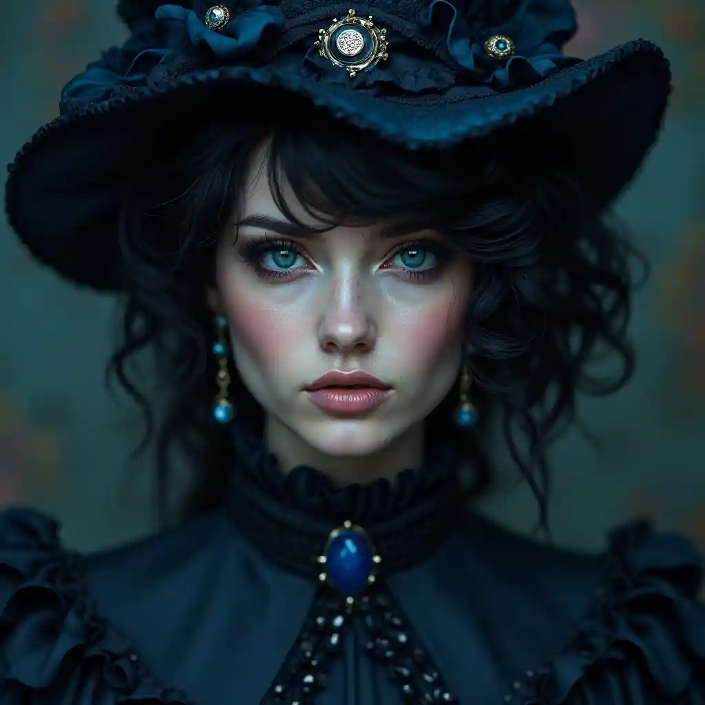 スチームパンクプリンセス、磁器の肌、漆黒の髪、詳細な顔のクローズアップ、鮮やかなコバルトブルーの色合い、エレガントな黒のローブと複雑な帽子、超高精細、ハイダイナミックレンジ、8 K解像度。.