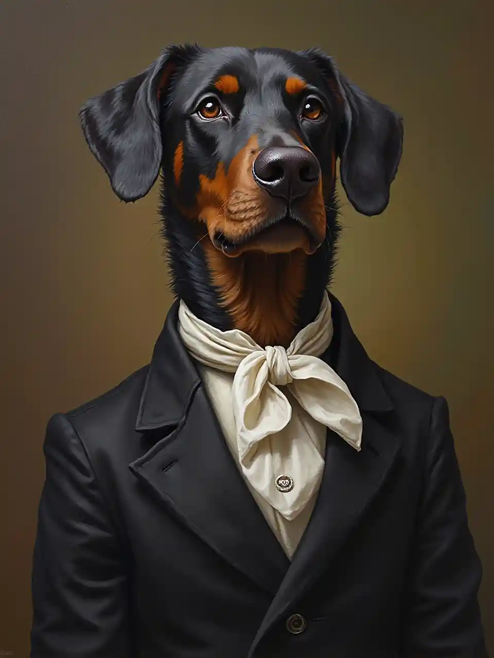 ダークスーツに白い蝶ネクタイをつけた犬の肖像画。.