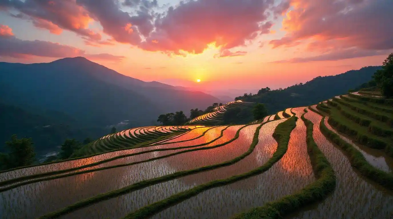 Terraced rice paddies, reflecting the colors of a brilliant sunset.