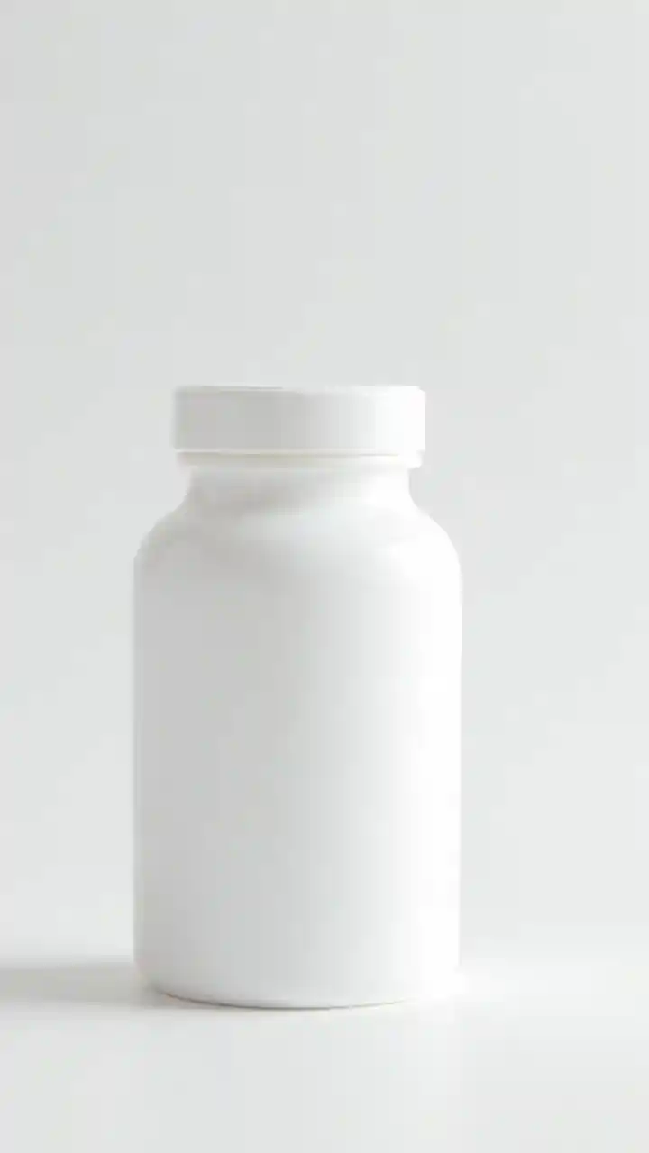 白い背景の下で製品の写真撮影、白いサプリメントのボトルの側面図、ラベルなし、現実的な、画像の中央にあるオブジェクト
