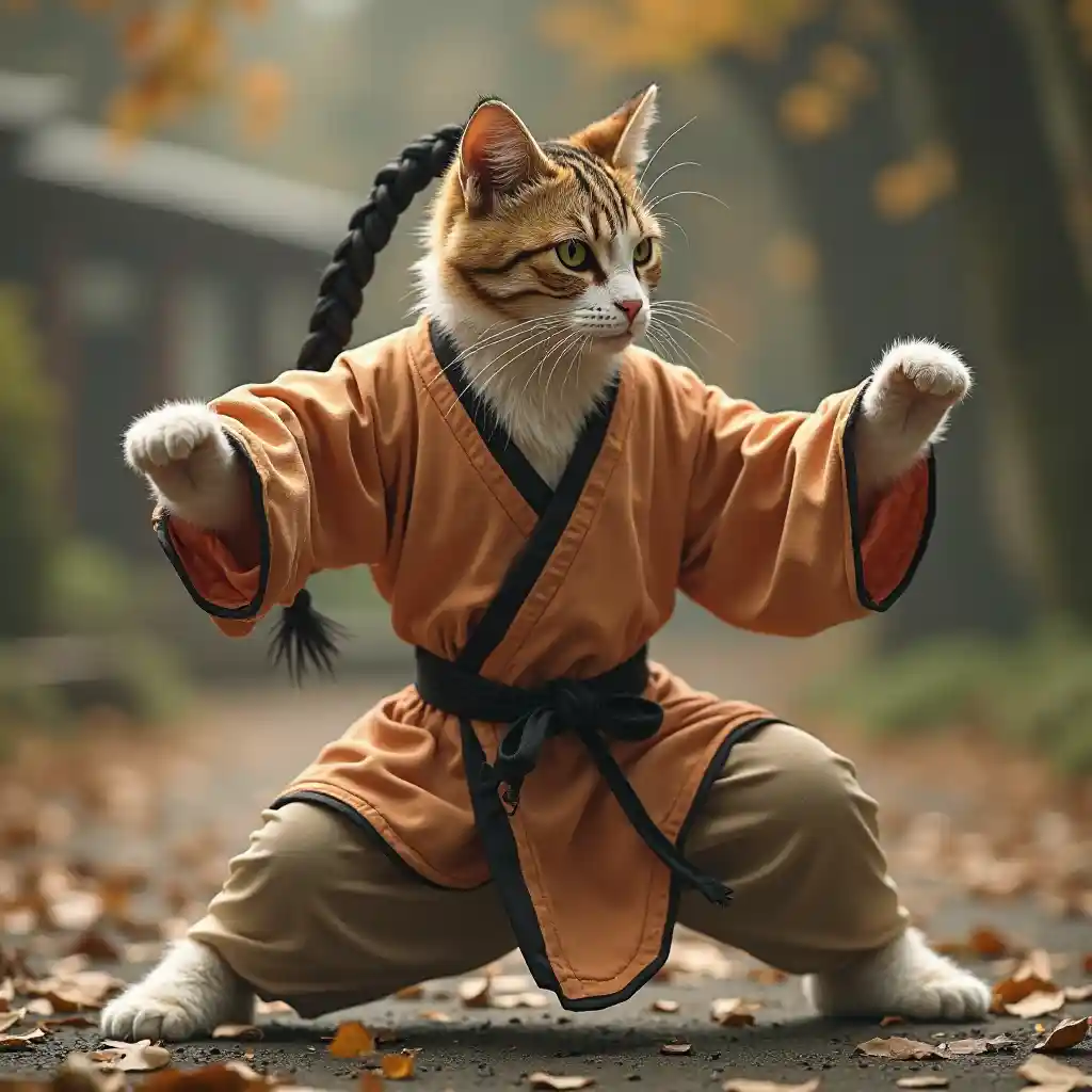 太極拳をする猫。. それは長いポニーテールを持っています,鉄拳の風水のように見えます