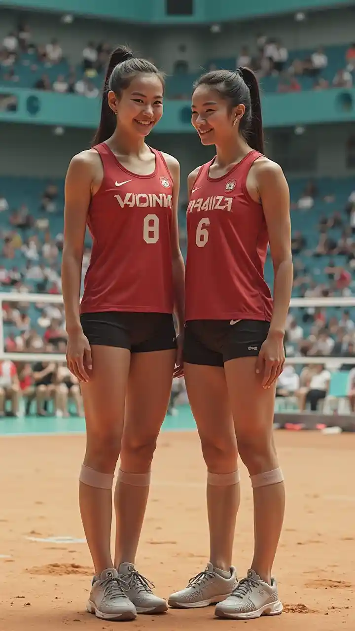 身長195 cmの中国女子バレーボール選手、小柄な141 cmのインドネシア女子バレーボール選手の隣に立つ