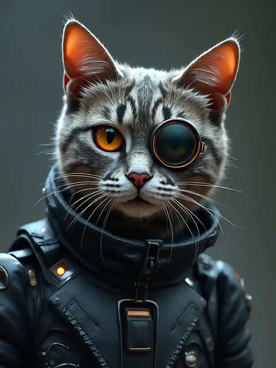 私をターミネーターにインスパイアされた猫にしてください。笑顔が滑らかで、眼鏡をかけています。