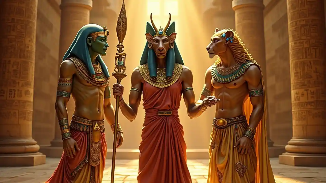 Ptah、Sekhmet、Nefertem、メンフィスのトリニティは、ヒエログリフと古代エジプトの遺物に囲まれた壮大な太陽の寺院に一緒に立っています。創造者の神Ptahはミイラの男として描かれています。肌は明るく、よくデザインされたフリンジの帽子とまっすぐで湾曲した偽のひげ、was、ankh、およびdjedのヒエログリフで飾られた笏を持っています。 彼の強さと知恵を象徴し、権威ある表情で高く立っています。Sekhmet、この獰猛な雌のライオンヘッドの女神は、エレガントに彼女の力強い体格の周りに流れるような深い赤のドレスを着て、右手にankhを持ち、強さと獰猛さを発散し、Nefertem、 若々しく優雅な神が立っていて、頭には繊細な青い睡蓮の花が飾られ、滑らかな金褐色の肌は空気のようなオーラを醸し出し、穏やかさと静けさを醸し出しています。または、ライオンヘッドの神として描かれ、穏やかで神秘的な笑顔を浮かべています。.