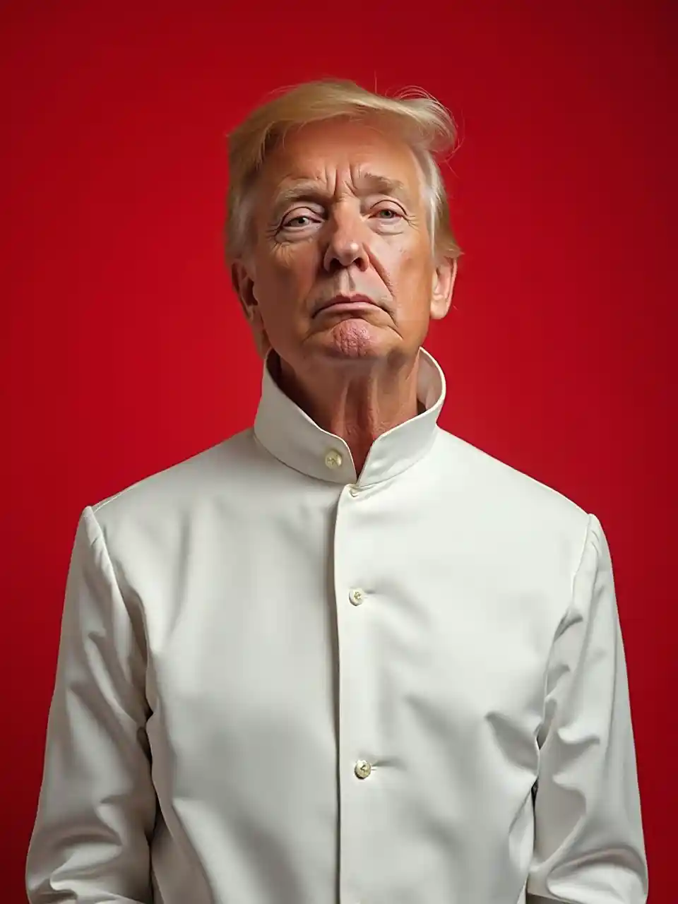 ドナルド・トランプ 元米国首相,前衛,写真撮影,すべての白いドレス,赤い背景,奇妙なハープ,カバー,ヘッドショット,スーパーリアル