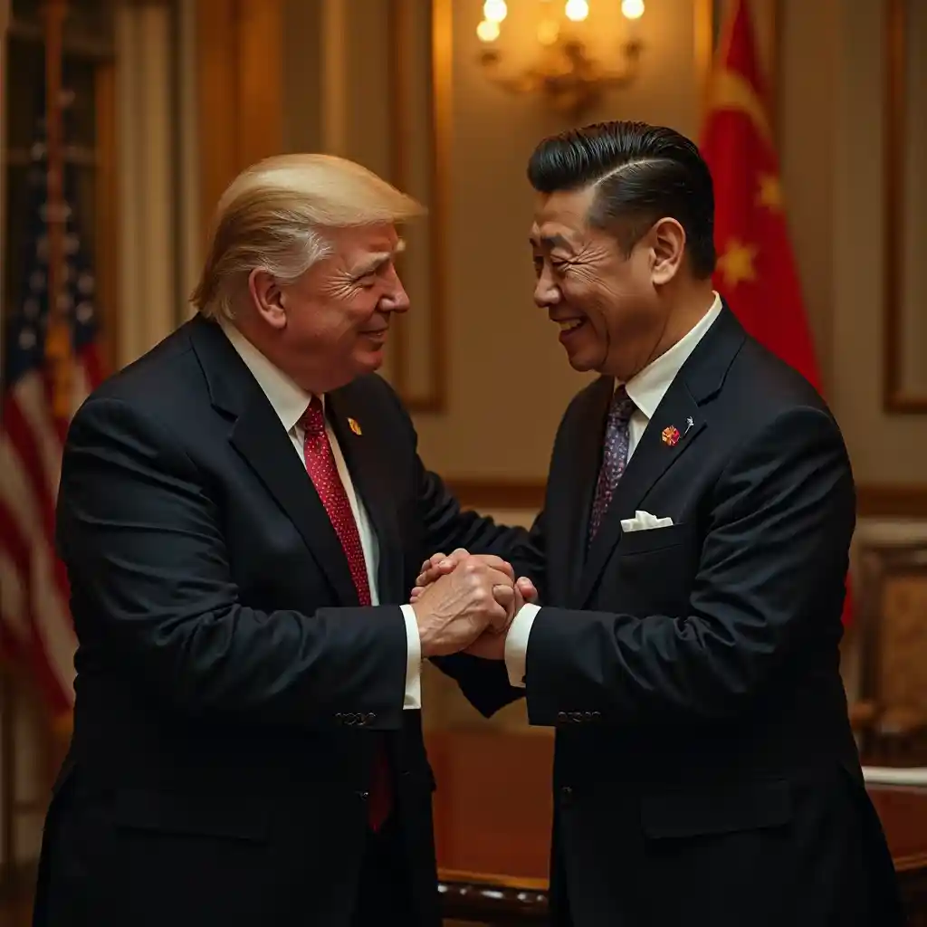 ドナルド・トランプは、米国とイスラエルの国旗のラペルピンを身に着け、中国の赤旗のラペルを身に着けた中国の習近平国家主席と腕で戦いました。華やかなマー・ア・ラーゴのインテリアを背景に、活気に満ちた金色のアクセントが空間を満たし、温かみのあるノスタルジックな光が柔らかい影を落とし、豊かでエレガントなロケーションが劇的な雰囲気を高め、現実的で、超詳細で、高精細で、権威あるユーモラスな表現を彼のポーズで示しています。. < < the _ marker > >