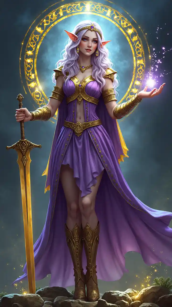 夢を見るという役割を与えられた。. A Sidhe/エルフ、異種、戦士、クリスタルサークルのメンバー。. アイルランドのケルト人。. 一部分は夢であり,一部分は現実であり,空気的であり,魔法的である。. 女性女性。. 背が高く、スポーティーで、強く、美しく、モデルのような態度。. 彼女の髪は非常に薄いバイオレットで、長いレイヤードカール、サイドスプリットの後のサイドスイープ、ふわふわしたカールが片方の目に落ちました。. 長いまつげを持つ美しいアメジストの目。. 彼女は頭にアメジストの入った金色の金属の被り物をしていた。. ゴールドとアメジストの槍のイヤリングが付いたエルフの耳。. 彼女の肩には金の金属製の胸当てがあり、ケルトのライオンをモチーフにした金の金属製の胸当ては、彼女が属する王室を象徴している。. 彼女の鎧の下には長袖のフィッティングバイオレットの上着があり、腕にはケルト柄の金色のブレスレットを身に着けている。. 彼女は腰に金の金属ベルトを締めていて、中央には三輪のシンボルがあった。. アメジストの配色が施された、バイオレットのレイヤードフリルニードレス。. メタリックカラーのゴールドブーツに、すね当てとハイヒールを合わせました。. マントピンで固定された明るいイエローゴールドのケルトトリムで覆われた長いバイオレットマント。. Sidheは光り輝く存在なので、彼女は太陽のようにきらきらと輝き、金色の閃光を放っています。. 彼女の魔力は多色のレインボースパークである。. それがうまくいかない場合、すべての精霊が剣を持っているように、彼女はギザギザの両刃の剣を持つ金色の剣を持っています。. 全身の姿勢で、水晶の輪の中に立って宝剣を持って魔法を使います。. 彼女の周りには様々な精霊が飛び交っている。.