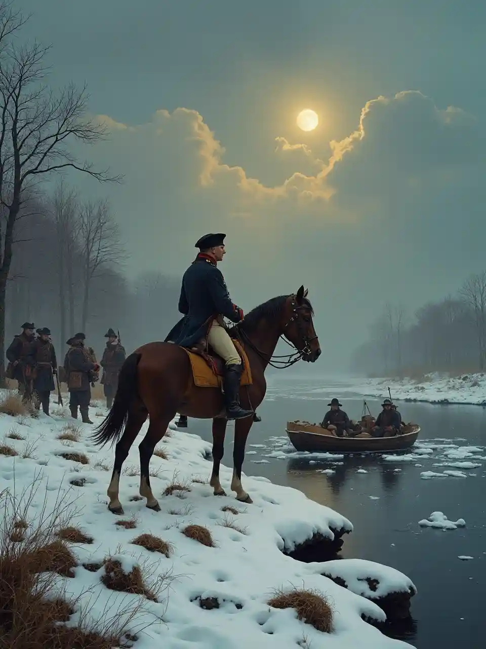 ジョージ・ワシントンは、雪の近くの川の近くに馬に乗っています彼の軍隊は、川の同じ側に木製のパントと一緒に月明かりの下で川に流氷を持っています。