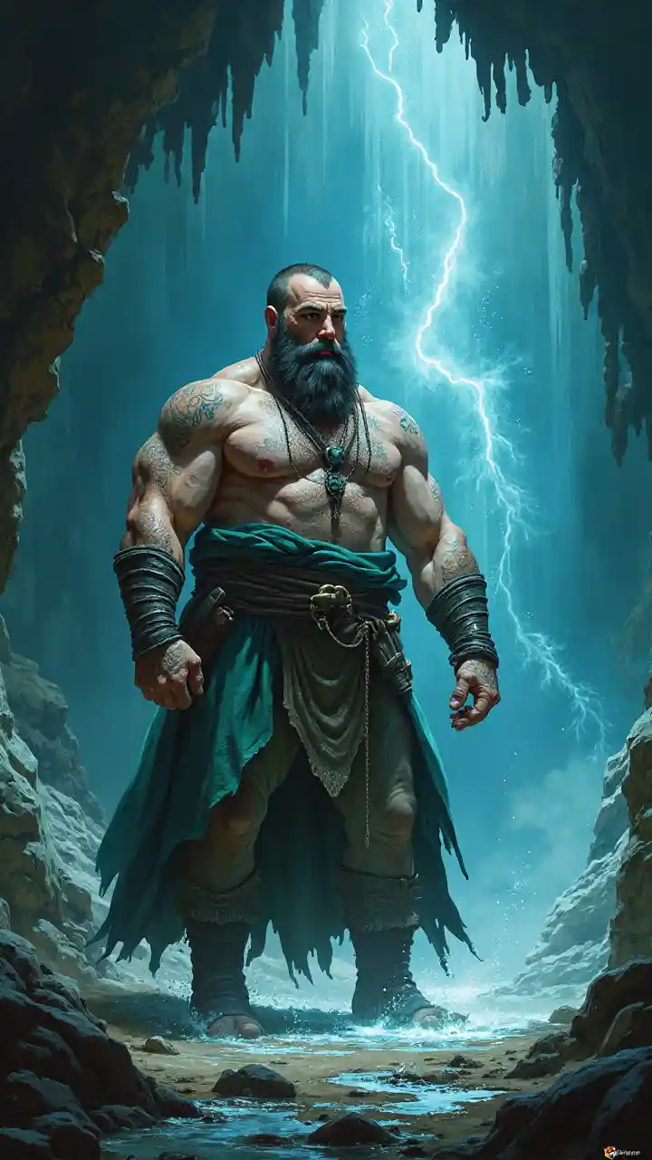 (胴体)男性ドルイド体35歳水ドルイド短い髪ひげ,戦いに従事しています魔法の洞窟で光の呪文を唱えます,アクションで,パスファインダー, d & d設定,現実的な,強化された画像,カラフル