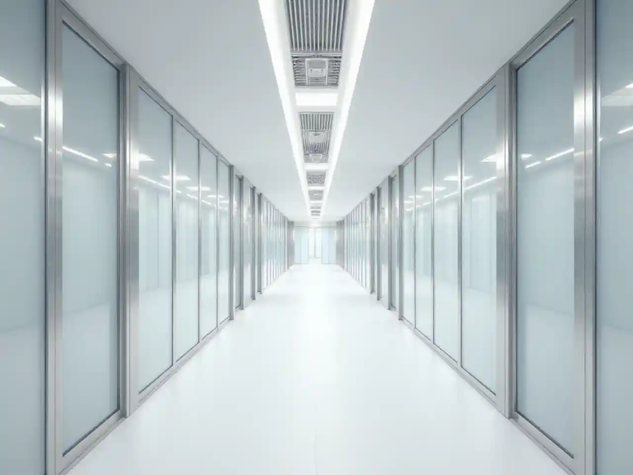 ガラス張りの壁の空の長い白いオフィスの廊下