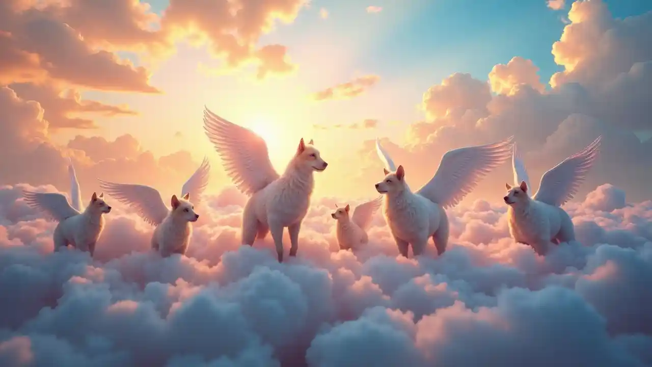 空に翼を持つ地球の動物、天体の雰囲気、活気に満ちたカラフルな雲、空の光、平和な雰囲気、魔法の風景、安らぎの感覚、ふわふわした雲、天国のような背景、動物の調和のとれた集まり、高ディテール、超ディテール、4 K品質、幻想的な静かな雰囲気、想像力と気まぐれな要素。.