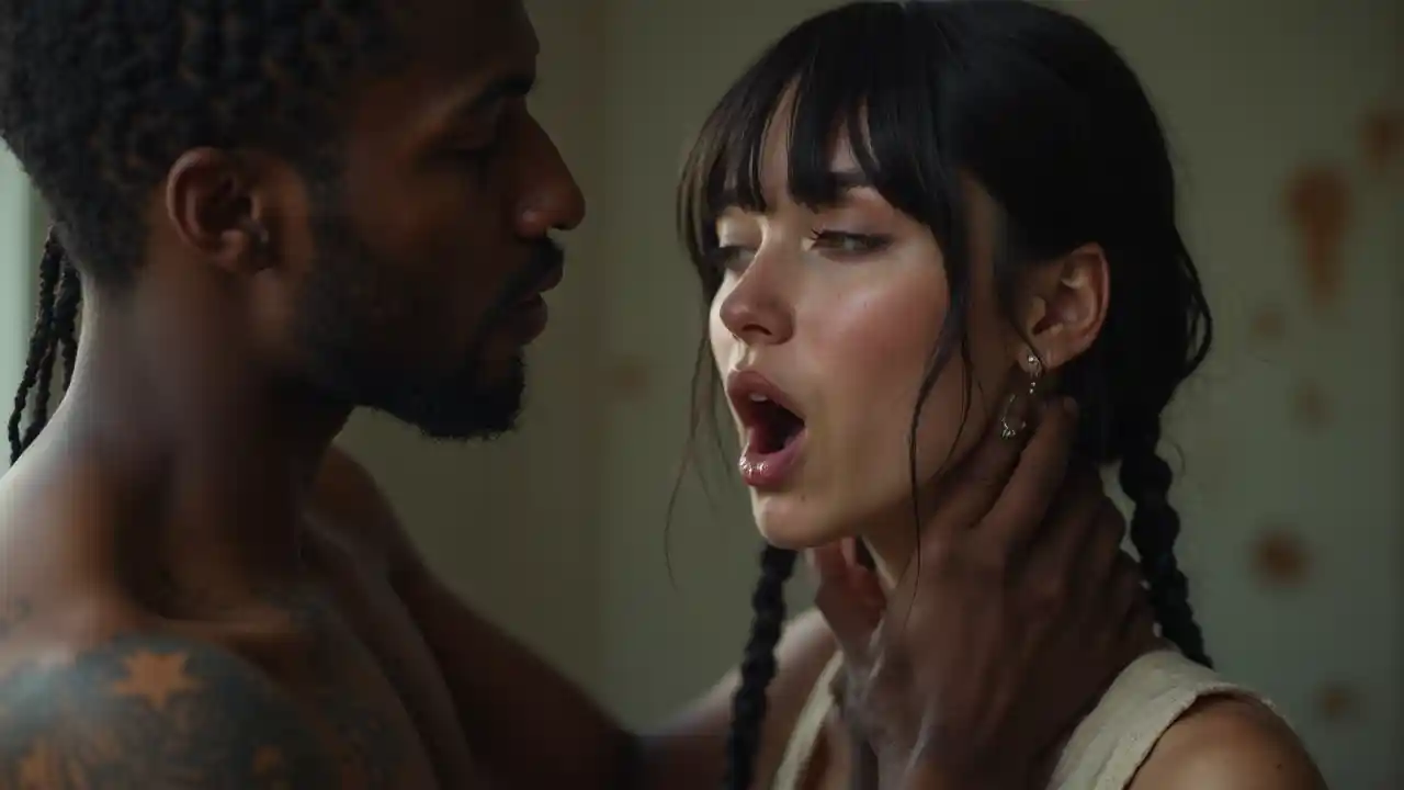 この若い女性は前髪とお下げをしている。. 彼女はフェイスピアスをしている。. 黒人男性が彼女の首をつかみ、彼女は荒い息をしている