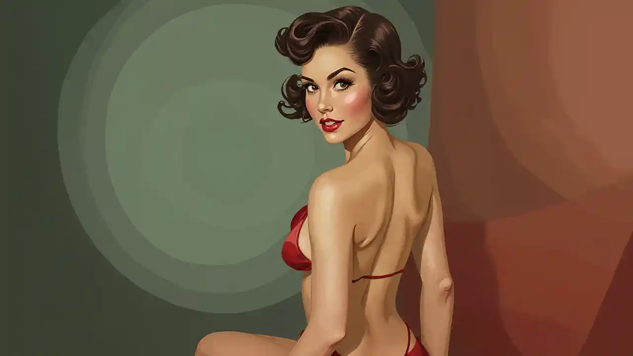 글래머 40의 핀업 걸 전신, 이미지 페이스를 이용한 숏컷 보브 헤어스타일, 흑발, 비키니