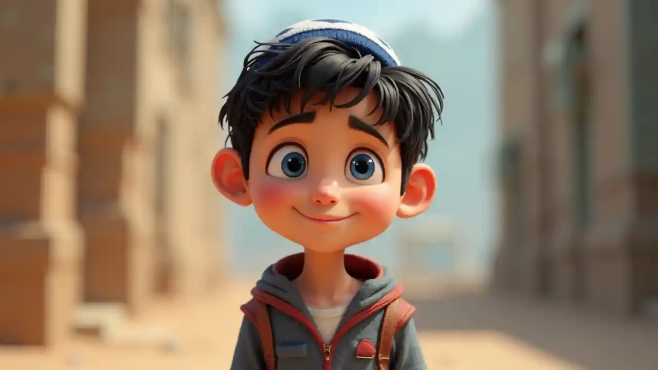 젊은 소년 모험가, 창조적이고 마음씨 착한 남자, 흑발에 푸른 눈, 작은 코, 웃는 입, 머리 위에 해군 모자를 쓰고 3D 스타일로 중앙에 서서 렌더링, 픽사 스타일로 사용한다.