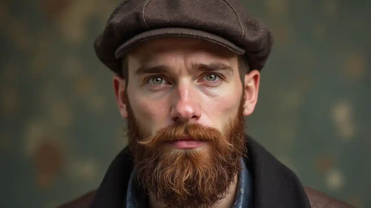 알비노 남성, 갈색 수염, 같은 수염색의 베레모 착용, 사각턱 모양