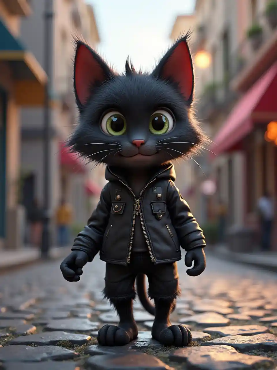 petit chat noiré bouriffé Rock Bad Egg Punk se promenant dans la ville rendu 3d style pixar