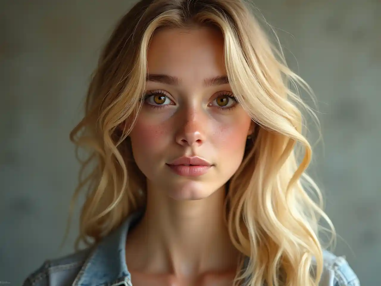 금발 소녀, (갈색 눈), 완벽한 얼굴, ((예쁜) ), 캐주얼한 옷, 매우 사실적인 피부 질감
