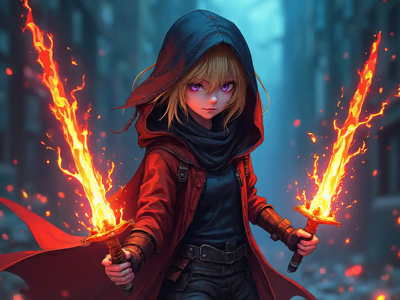 대표작, 두건을 쓴 도적 암살자 소녀, 그림자에 가려진 금발머리, 양손에 각각 불타는 단검을 든 생동감 넘치는 발광 심연의 색채, 프레임에 완전히 들어간, 전신이 꽉 차서 전기 에너지를 뿜어내는, 어깨에 지저분한 머리카락, 전신, 아름다운 애니메이션 waifu 스타일의 소녀, 초 디테일한 작화, 발광력, 카르네 그리피스와 와딤카신 컨셉아트의 예술,8k 해상도, 프랙탈 동등 디테일 생체 발광, 3D 렌더링, 옥탄가 렌더링, 복잡한 디테일, 필름, 트렌드 아트 스테이션 등거리 중심 초사실적 커버 사진 놀라운 풀 컬러, 손으로 그린 강인함, 사실적인, 복잡함, 히트 정의, 필름, 거친 스케치, 대담한 선, 종이에 활력,에픽, 초고품질 모델