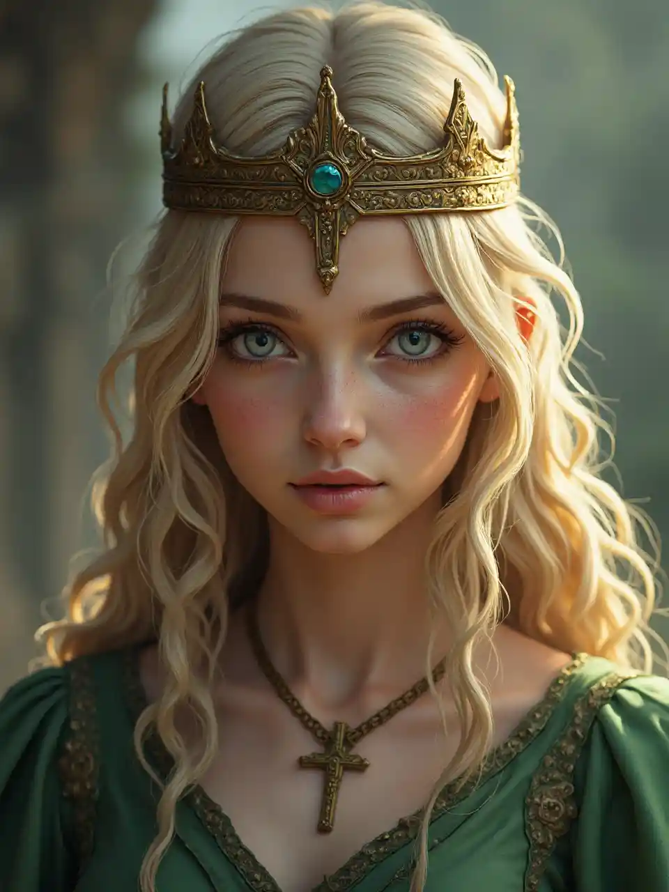 전사 여왕, 금발 하이라이트, 청록색 눈, 왕관, 십자가