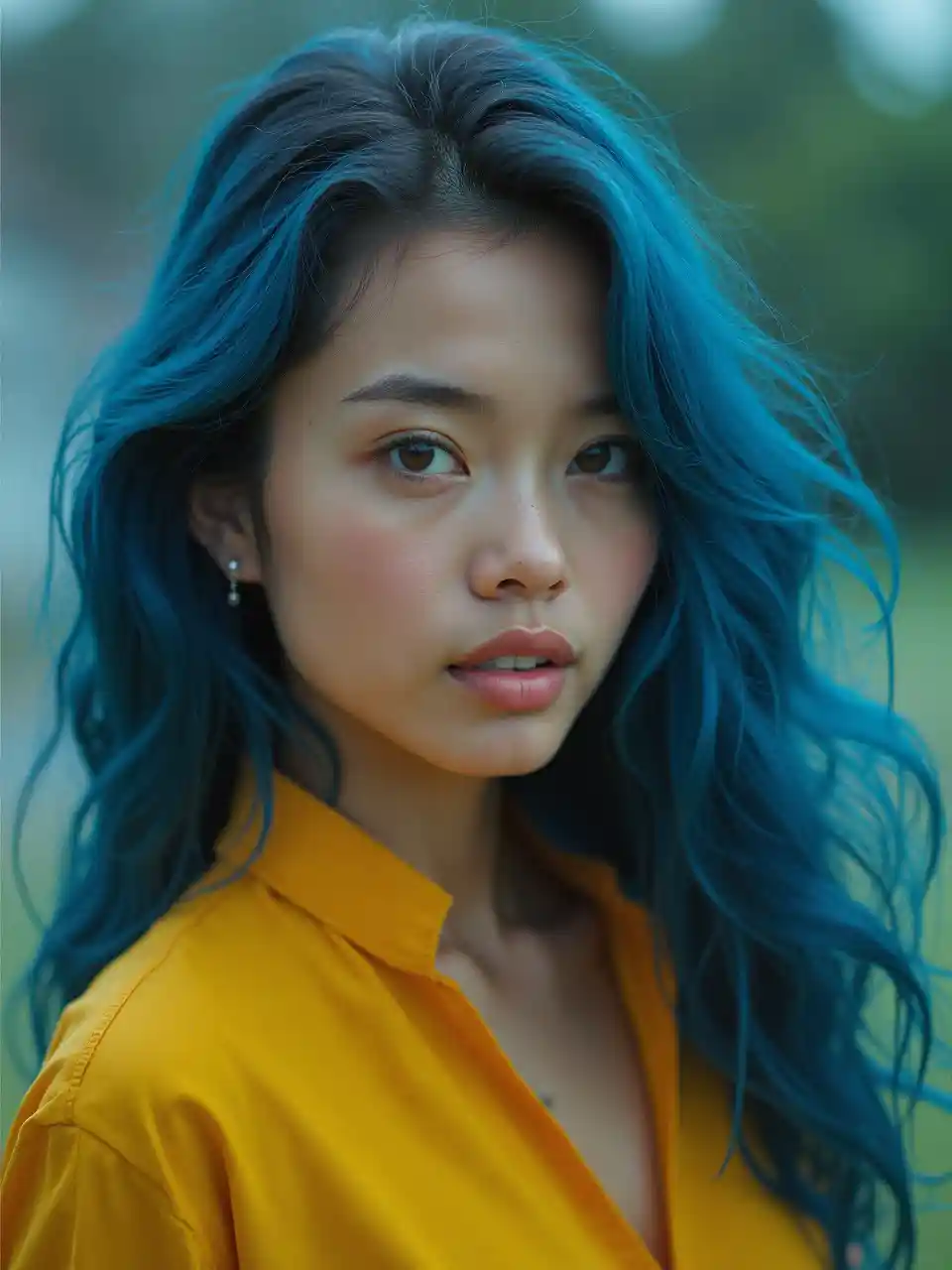 그녀의 등을 따라 내려오는 우아한 푸른 머리카락과 그녀의 시선에 매혹적인 갈색 눈을 가진 멋진 젊은 여성.그녀는 따뜻함과 깊이를 발산하며 활기찬 노란색 셔츠는 그녀의 활기찬 성격을 반영하여 장면에 폭발적인 색상을 추가합니다.부드럽고 몽환적인 조명은 그녀의 매력적인 이목구비를 영화처럼 흐릿하게 물들입니다.전체적인 분위기는 차가운 아우라를 띠고 있어 쿨한 톤을 드러내며 미스터리와 음모를 불러일으킨다.이 독창적 인 다큐멘터리는 정교한 보존된 세부 사항으로 여전히 매혹적입니다.